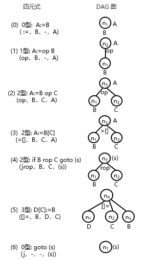 一个基本块,可用一个DAG来表示,对基本块中每一条四元式代码,依次构造对应的DAG图,最后基本块中所有四元式构造出来DAG连成整个基本块的DAG。